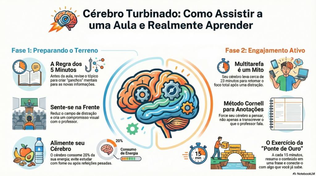 Assistir a uma aula com eficiência exige postura, estratégia e as ferramentas certas. Aplique o Método Cornell, sente-se na frente e, acima de tudo, mantenha-se ativo. Seu cérebro é um músculo; se ele não estiver “suando” durante a aula, ele não está crescendo.